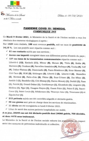 صدر عن وزارة الصحة السنغالية البيان رقم 345ليوم الثلاثاء 9فبراير 2021, والذي يتضمن تقييما لوضعية وباء ” كوفيد 19″: