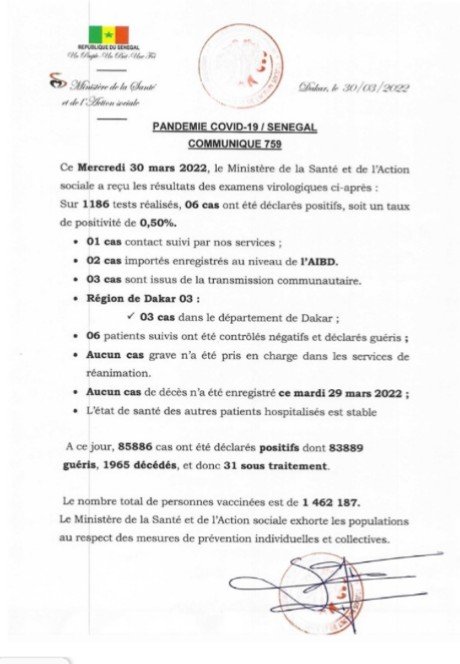 من بين 1186 اختبارًا تم إجراؤها ، سجلت السنغال 06 إصابات جديدة بفيروس كورونا من بينها 03 حالات مجتمعية و 01 حالة مخالطة و 02 حالة وافدة.
