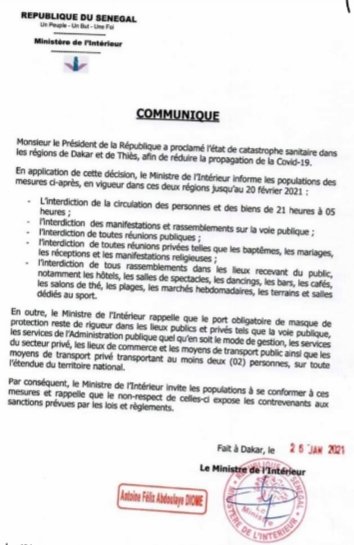الوثيقة الموقعة من طرف وزير الداخلية تضمنت الإجراءات التي تقتضيها حالة الطواري والتي اعلن عنها رئيس الجمهورية في منطقتي داكار وتييس ، من أجل الحد من انتشار Covid-19.