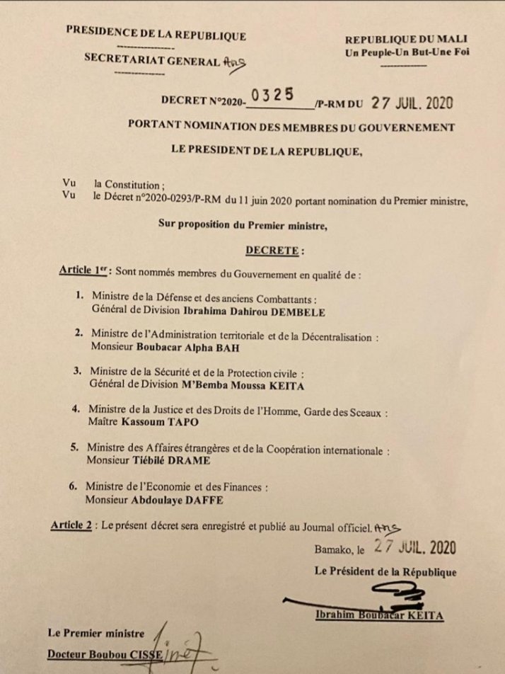 أعلن الرئيس المالي إبراهيم بوبكر كيتا في مرسوم صادر عنه، تعيين حكومة مصغرة، تضم 6 وزراء ستوكل لها مهمة التفاوض من أجل تشكيل حكومة وحدة وطنية، استجابة لتوصيات قمة “الإيكواس” التي انعقدت الاثنين لبحث سبل حل الأزمة المالية.