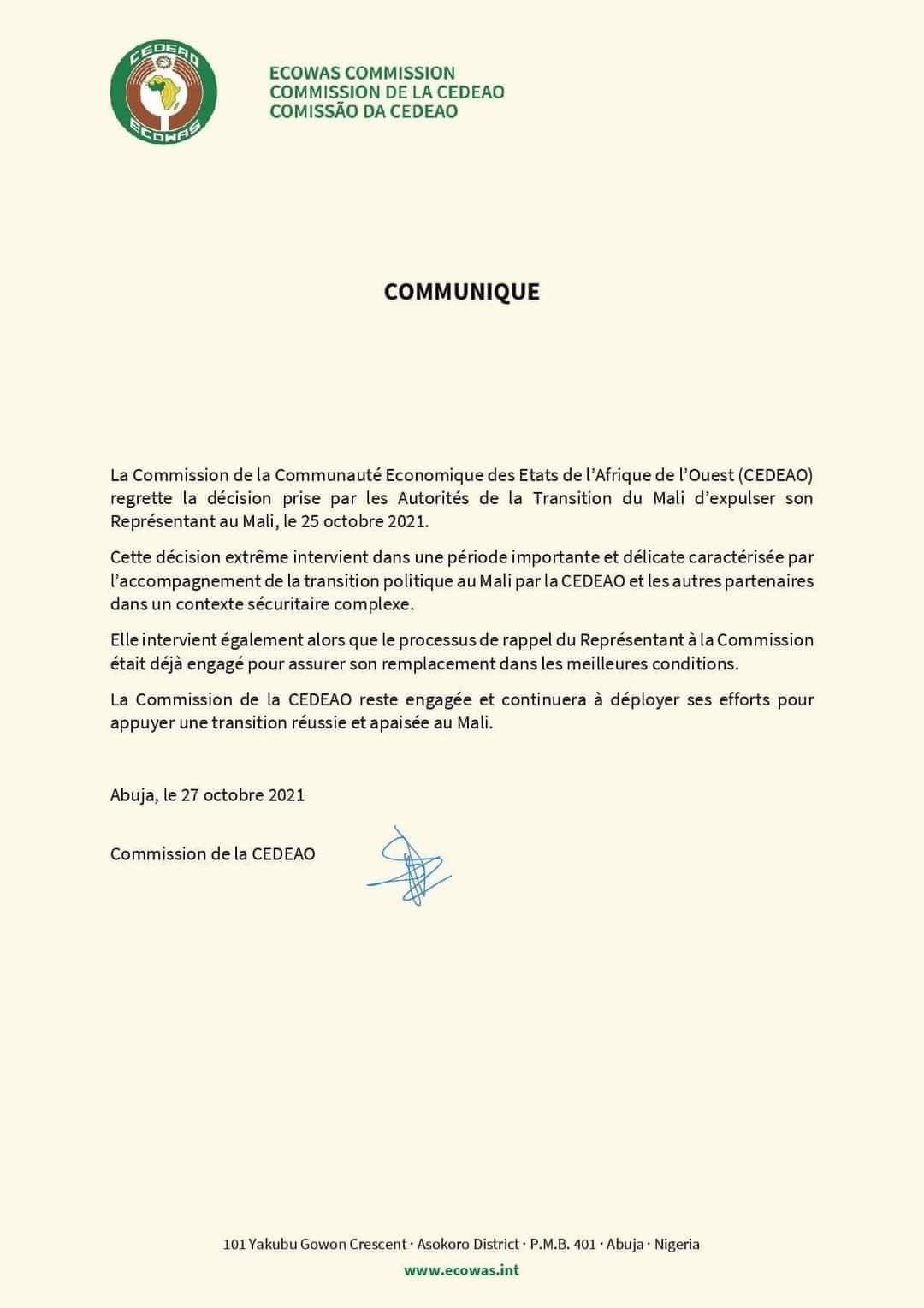 إن مفوضية الجماعة الاقتصادية لدول غرب إفريقيا الإيكوس تأسف للقرار الذي اتخذته السلطات الانتقالية في مالي بطرد ممثلها في مالي ، 25 أكتوبر 2021. يأتي هذا القرار المتطرف في فترة مهمة ودقيقة تتميز بدعم الانتقال السياسي في مالي من قبل المجموعة الاقتصادية لدول غرب أفريقيا وشركاء آخرين في سياق أمني معقد.