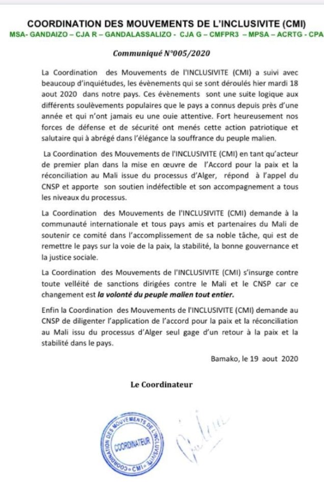 نقلا عن موقع الأخبار – عبرت تنسيقية الحركات الشمولية عن دعمها الثابت “للعملية الوطنية والناجعة” التي قامت بها قوات الدفاع والأمن المالية، حيث أطاحت بالرئيس المالي إبراهيم بوبكر كيتا.