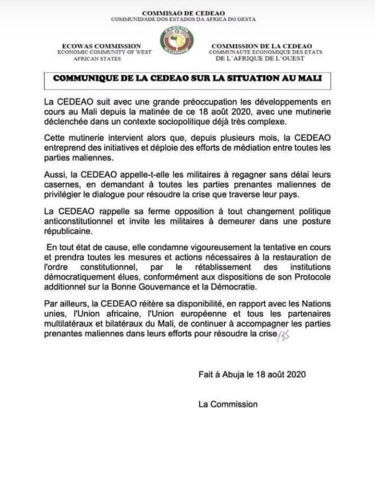 قالت مجموعة الاقتصادية لدول غرب إفريقيا (الإيكواس) في بيان لها “أنها تتابع بقلق بالغ التطورات الجارية في مالي منذ صباح اليوم، اثر تمرد اندلع في سياق تدهور في الحياة اجتماعي وسياسي معقد للغاية في الدولة “