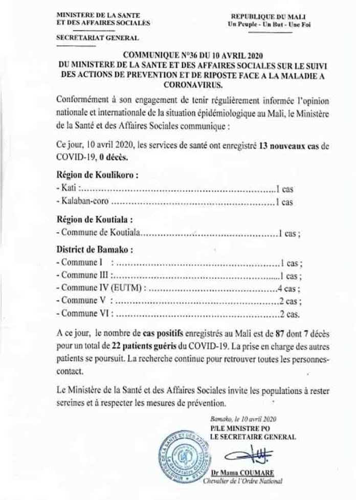 مالي تسجل 13 حالة إصابة جديدة بفيروس كورونا المستجد، ما يرفع عدد الإصابات المؤكدة في البلاد إلى 87 حالة وفق ما جاء في بيان لوزارة وزارة الصحة.