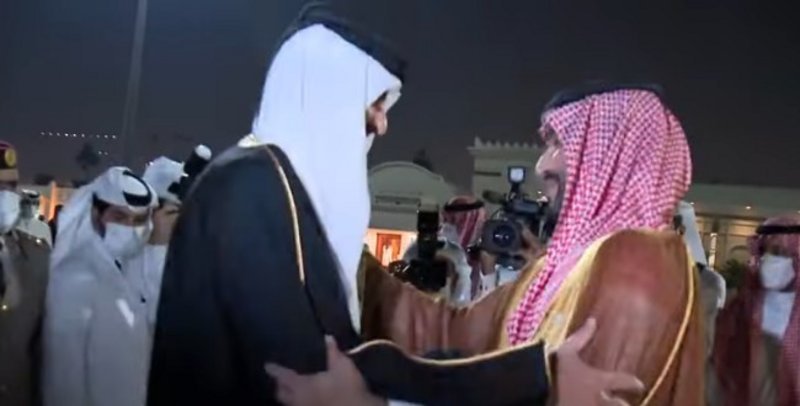 وأظهر مقطع فيديو متداوَل الاستقبال الحار من جانب أمير قطر لولي العهد عند سُلَّم الطائرة، قبل أن يصطحب سموه إلى الديوان الأميري؛ لتُجرى مراسم استقبال رسمية للأمير محمد بن سلمان.