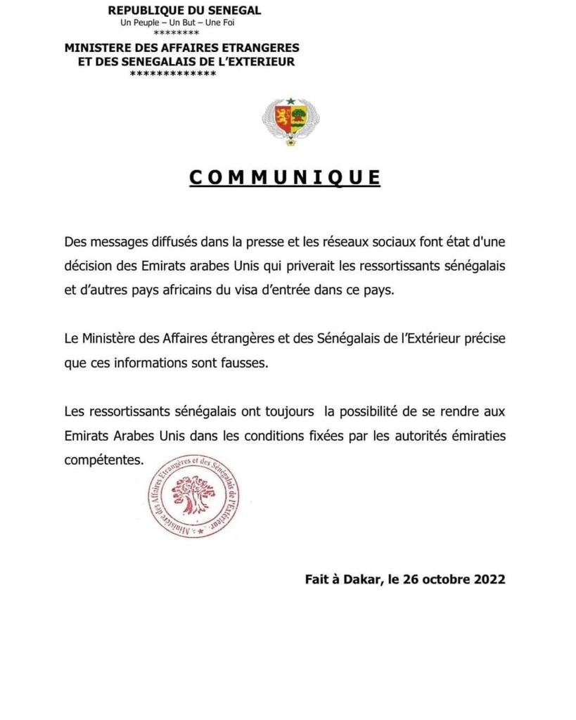 وقال البيان الصادر من الوزارة : بإمكان السنغاليين السفر إلى الإمارات العربية المتحدة وفق الشروط التي تضعها السلطات الإماراتية.