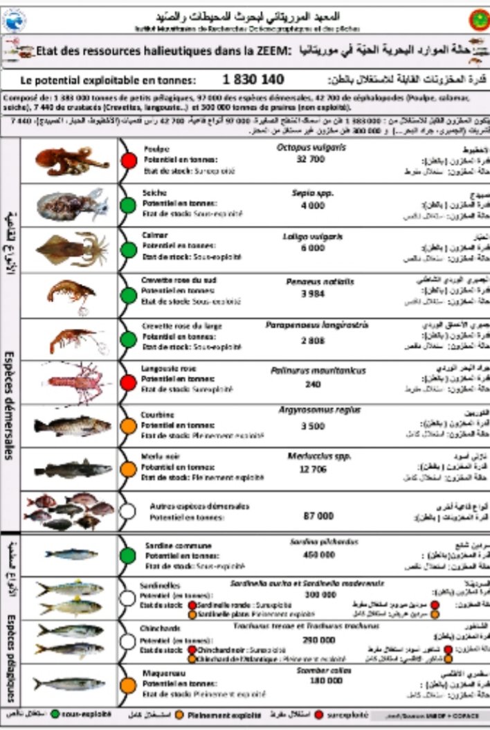 افاد موقع الاخبار الموريتاني أن نشرية صادرة عن المعهد الموريتاني لبحوث المحيطات والصيد اظهرت حالة الموارد البحرية الحية في موريتانيا أن حالة مخزون الإخطبوط بموريتانيا تعرف استغلالا مفرطا.