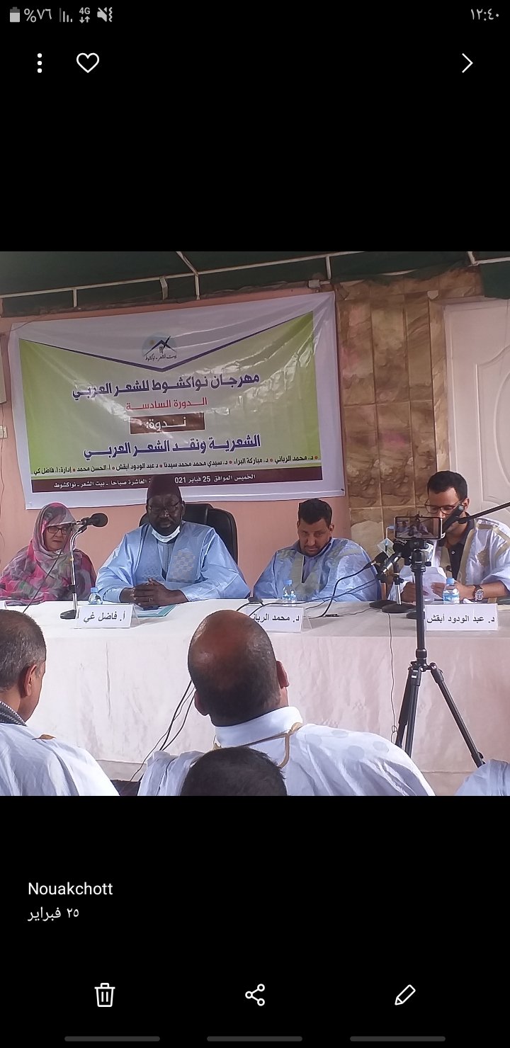 تتواصل لليوم الثالث فعاليات النسخة السادسة لمهرجان انواكشوط للشعر العربي، وتميزت فعاليات اليوم بتنظيم ندوة تحت عنوان: الشعرية ونقد الشعر العربي، تولى رئاسة جلساتها الاستاذ “فاضل غي” رئيس النادي الادبي السنغالي.