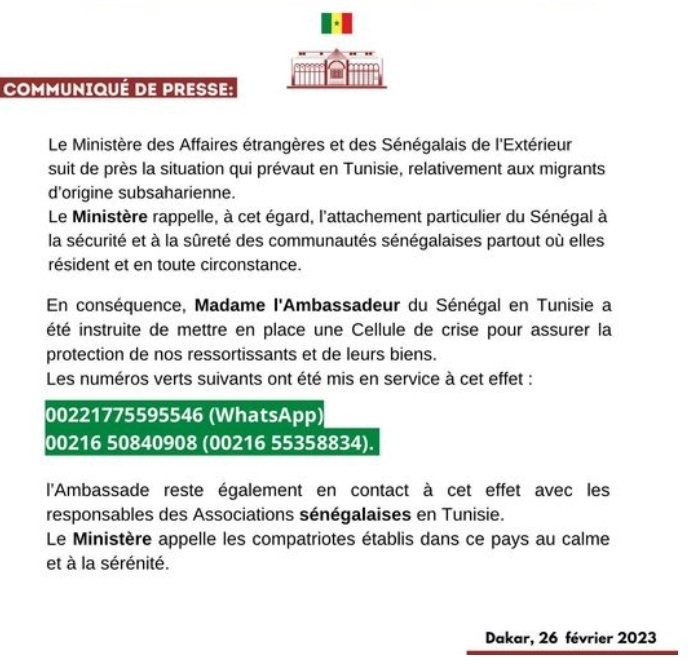 واكدت وزارة الشؤون الخارجية والسنغاليين في الخارج إنه صدرت تعليمات للسفير السنغالي في تونس لإنشاء وحدة الأزمات لضمان حماية المواطنين السنغاليين وممتلكاتهم ” ،