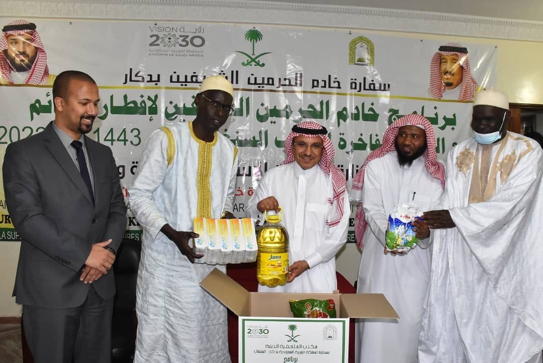 دشنت وزارة الشؤون الإسلامية والدعوة والإرشاد ممثلة بالملحقية الدينية بسفارة المملكة العربية السعودية لدى السنغال برنامجي خادم الحرمين الشريفين لتفطير الصائمين وتوزيع التمور لعام 1443 وذلك بمقر الملحقية بداكار اليوم، حيث حضر مراسم التدشين سعادة سفير خادم الحرمين الشريفين في جمهورية السنغال الاستاذ سعد بن عبد الله النفيعي، والمستشار الاعلامي الاستاذ حمد الغاشم ورئيس بلدية روفيسك الاستاذ إلمان ساخو سيمبين، والملحق الديني بالسفارة الشيخ وحيد محمد مجربي، وعدد من رؤساء الجمعيات والمراكز الاسلامية، ورجال الاعلاميين.