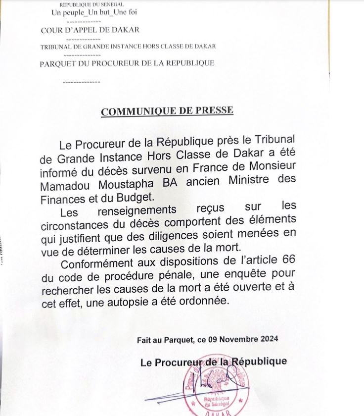 توفي مامادو مصطفى باه وزير المالية السابق، عن عمر يناهز 59 عاما في باريس يوم 4 نوفمبر، بعد صراع قصير مع المرض. وفيما ينتظر وصول جثمانه إلى دكار ، فتحت النيابة العامة، وفقا لأحكام المادة 66 من قانون الإجراءات الجزائية، تحقيقا لتحديد أسباب الوفاة وأمر بتشريح الجثة.
