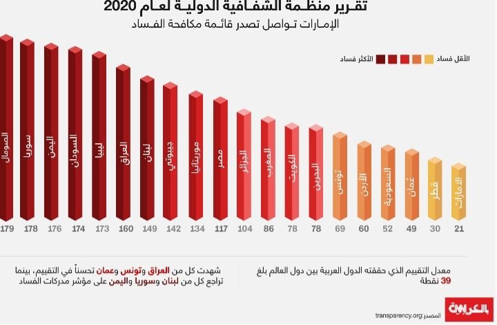وذكر التقرير إن كلا من العراق وتونس وعُمان قد شهدت تقدما في تقييمهم السنوي، بينما شهدت سوريا واليمن ولبنان تراجعا في التقييم العام لمكافحة الفساد.