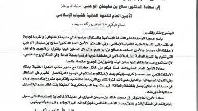 بعث الأستاذ عبد الكريم سار رئيس جمعية الوحدة لنشر الثقافة الإسلامية بالسنغال بخطاب الشكر والتقدير لمعالي الأمين العام للندوة العالمية…