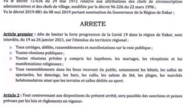 أصدر هذه الليلة حاكم دكار قرارا يقضي بمنع التجمعات في الساحات العامة، وفي المناسبات الدينية، والاجتماعية، وفي المحلات التجارية اعتبارا…